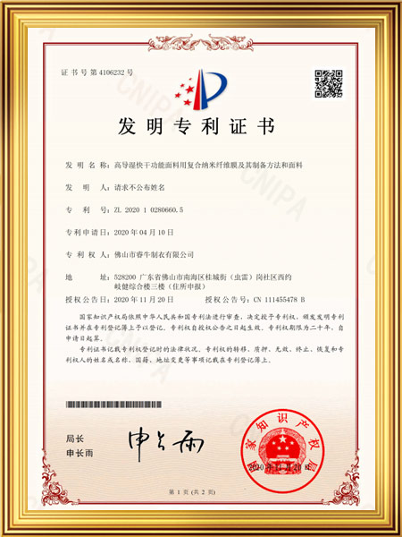 高導(dǎo)濕快干功能面料用復(fù)合納米纖維膜及其制備方法和面料證書